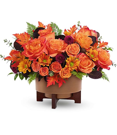 Teleflora’s Fall For Copper Centerpiece is arranged in Teleflora’s Modern Copper Planter with wooden stand. It features orange roses, orange spray roses, bronze daisy spray chrysanthemums, and purple button spray chrysanthemums. Accents include cotinus, spiral eucalyptus, huckleberry, and leatherleaf fern.